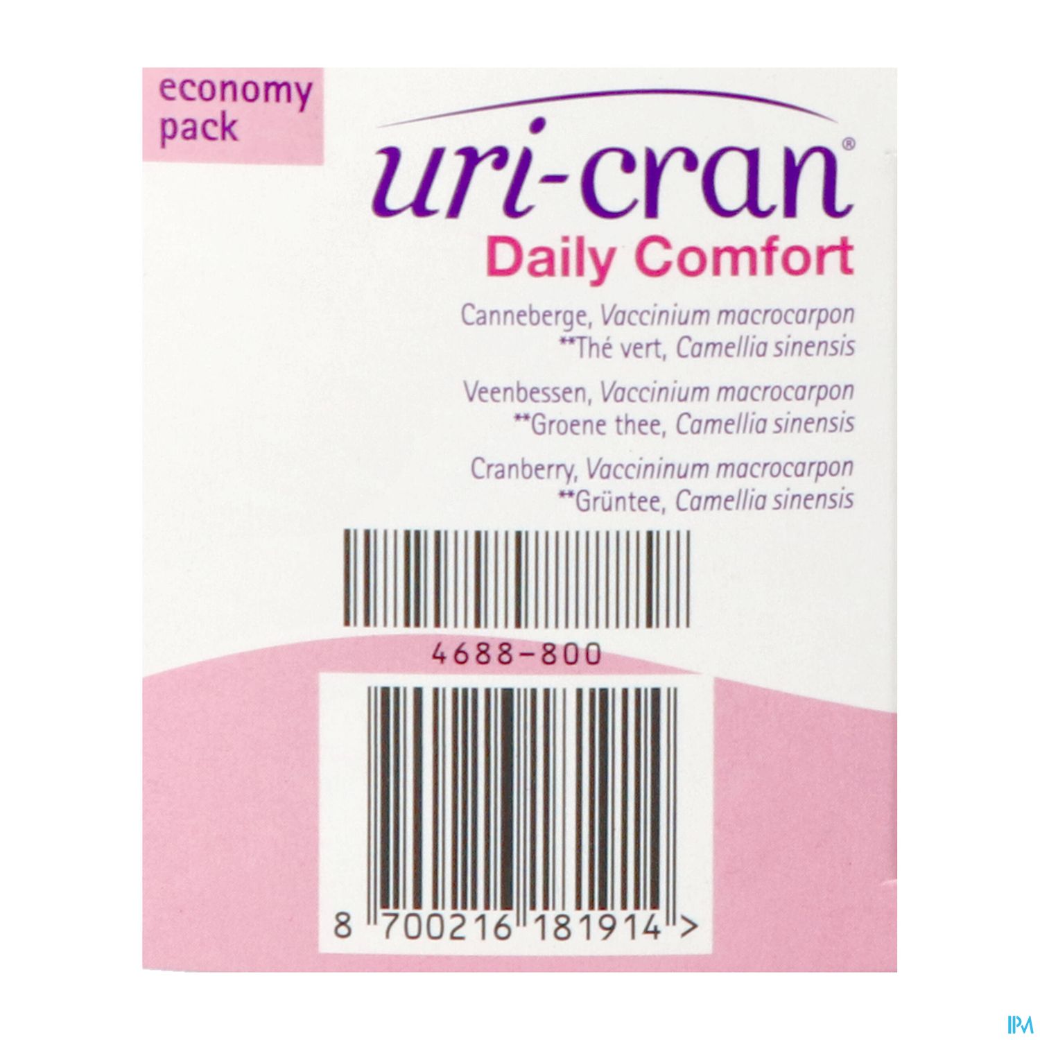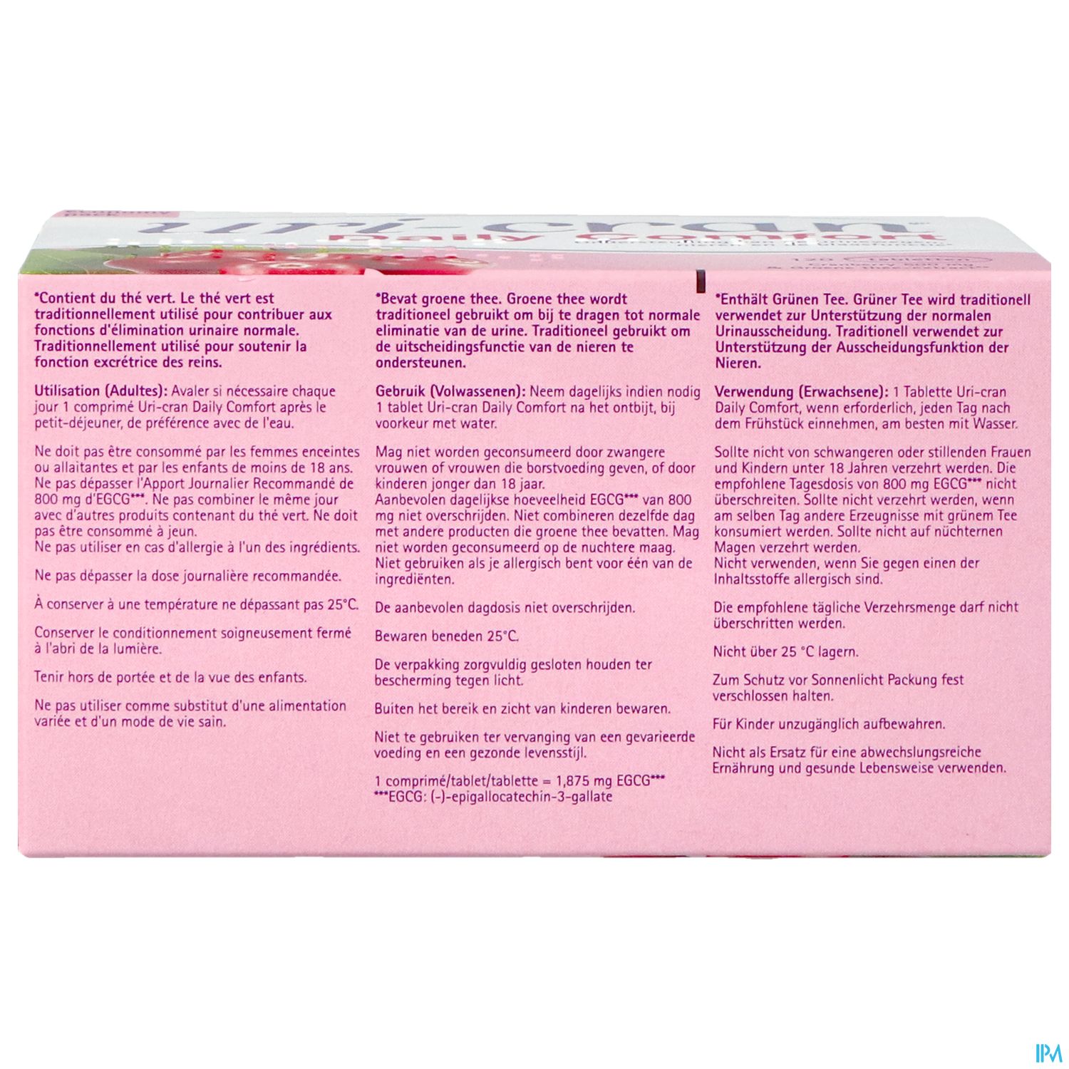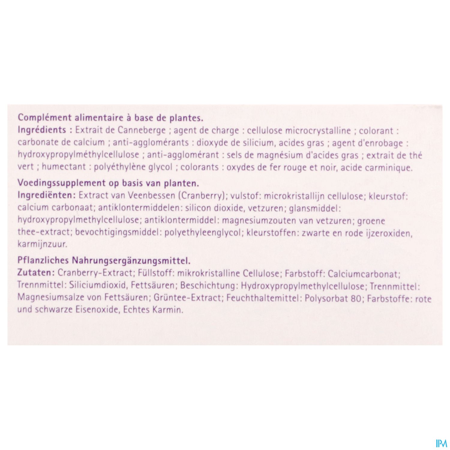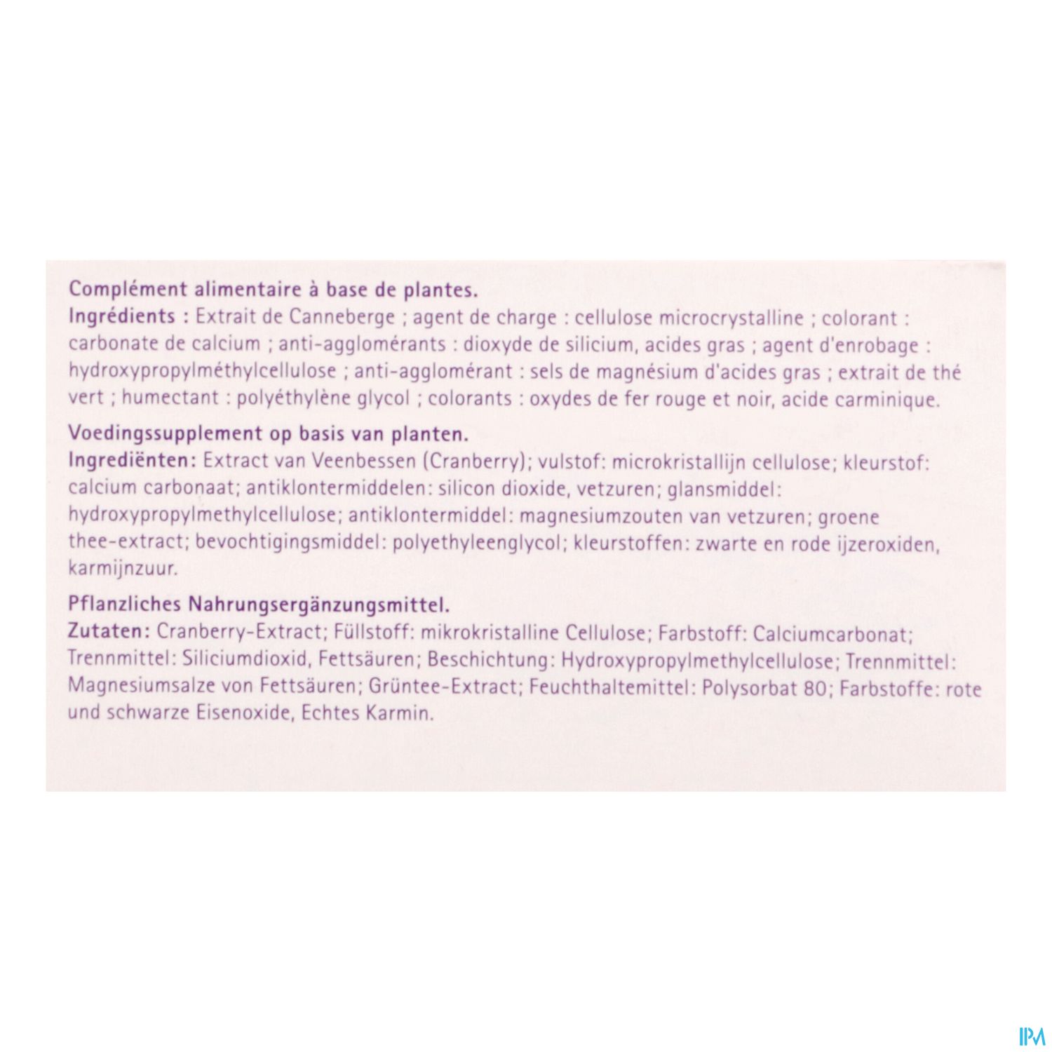 Extract van Veenbessen (Cranberry) (500mg); vulstof: microkristallijn cellulose; kleurstof: calcium carbonaat; antiklontermiddelen: silicon dioxide, vetzuren; glansmiddel: hydroxypropylmethylcellulose; antiklontermidel: magnesiumzouten van vetzuren; groene thee-extract; bevochtingsmiddel: polyethyleenglycol; kleurstoffen: zwarte en rode ijzeroxiden, karmijnzuur.